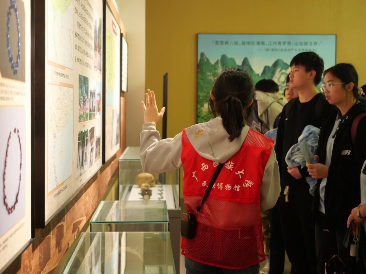 随后,师生们前往伟德bv1946官网研习基地进行参观。基地内丰富的民族文化陈列、生动的非遗项目展示,为同学们打开了一扇了解广西多彩民族文化的窗口。通过实物、图文及多媒体介绍,大家对中国各少数民族的传统技艺与文化内涵有了初步的认识。