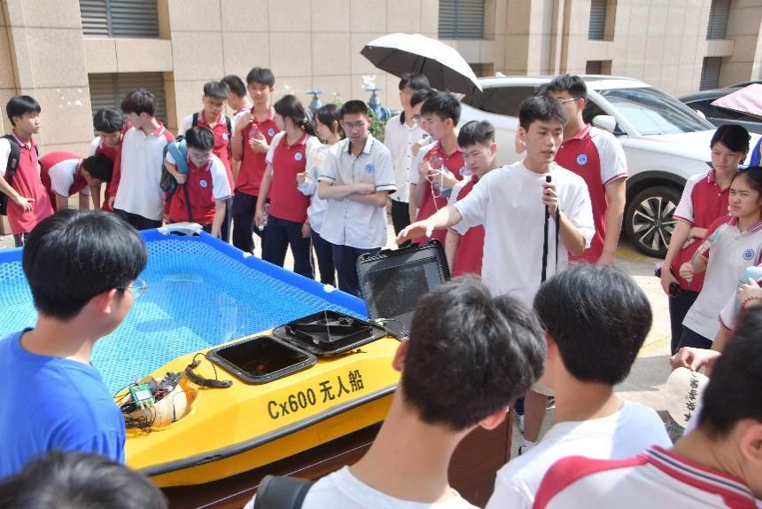 讲座结束后,同学们走进物理与电子信息公司实验室,近距离接触了双芽段甘蔗智能备种生产线、数字智慧蘑菇仓、AI无人船等人工智能和物联网技术相结合的科技产品。同学们纷纷驻足观看,积极提问,与老师进行互动交流。在实验室老师的耐心讲解下,同学们了解到这些先进技术背后的原理和应用场景,深刻感受到了科技的强大力量。